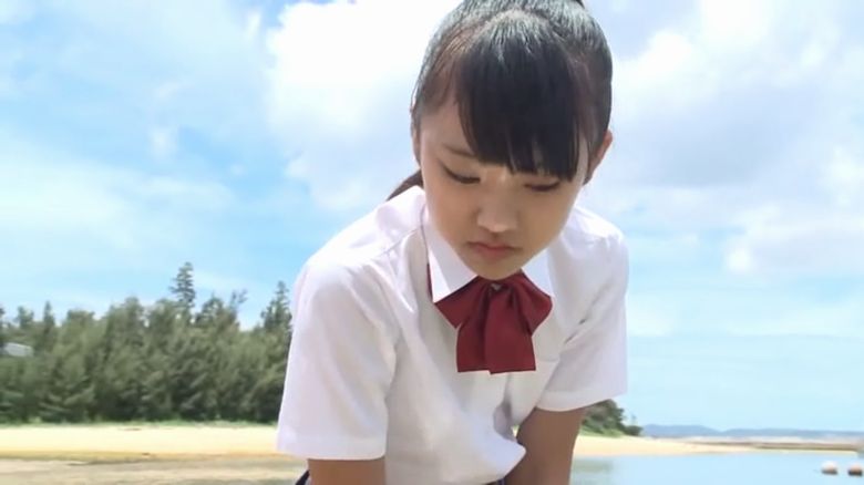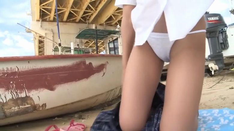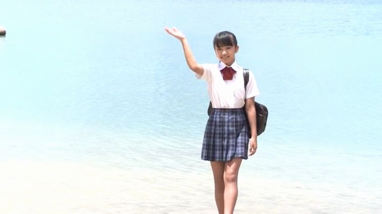 制服姿で海に入ってはしゃぐ杏珠ちゃん。海水で濡れたスカートを絞り、白下着チラを見せつけてくれます。