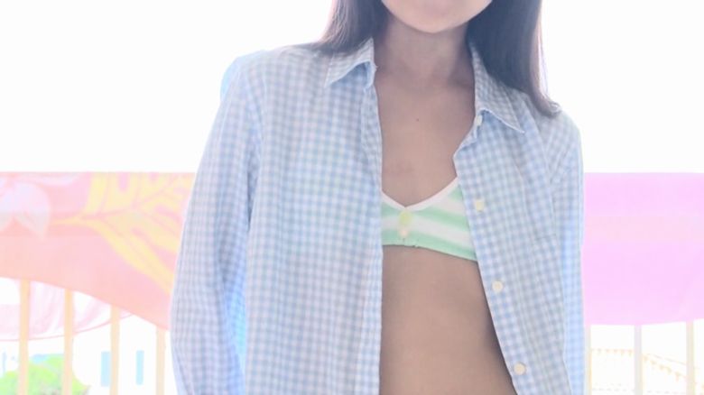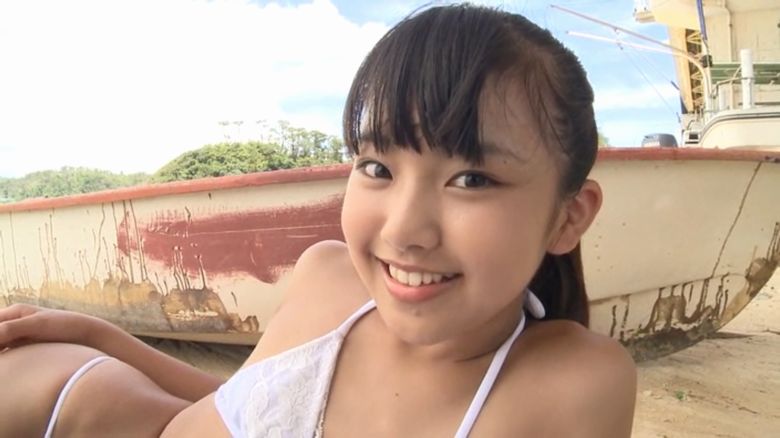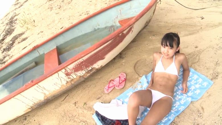 服を脱いでビキニ姿になります。香月杏珠ちゃんのつるペタボディを堪能できます。