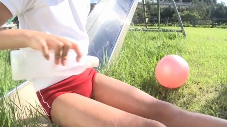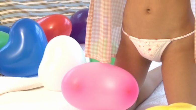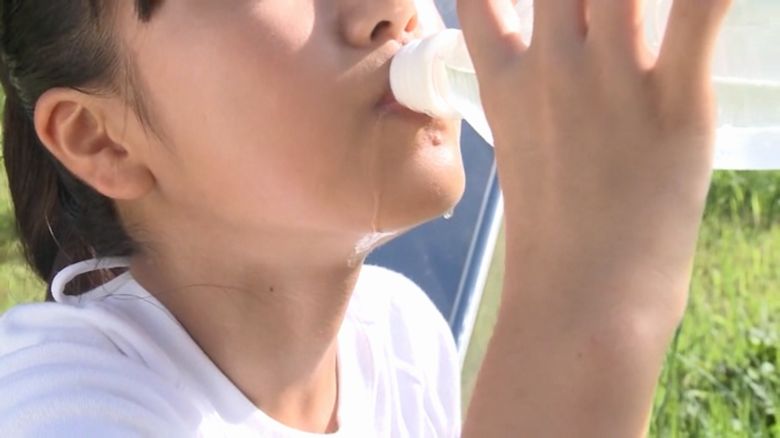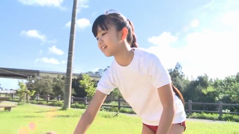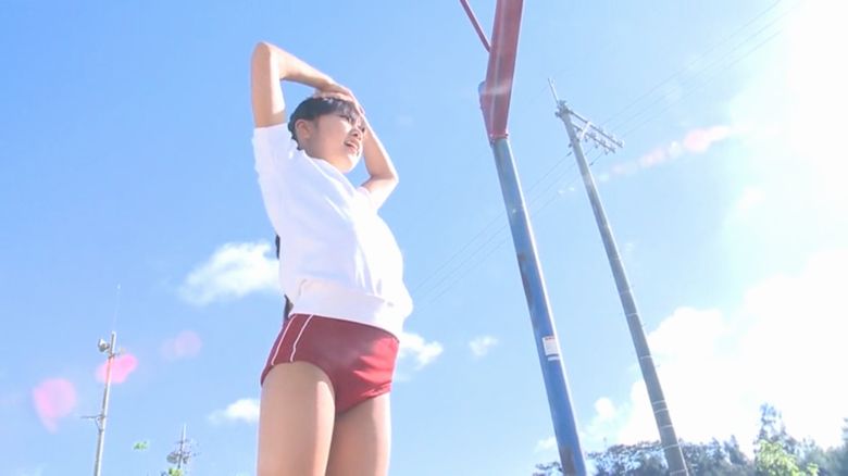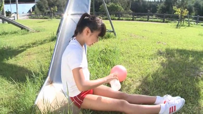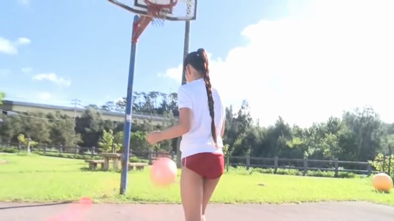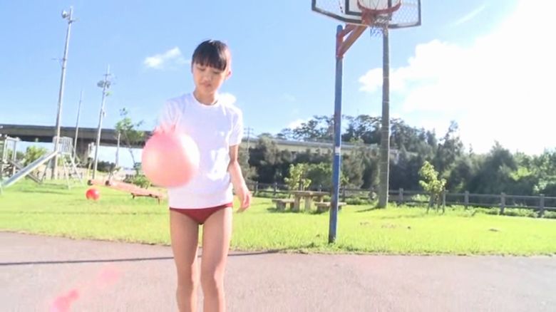 体操服姿でボールで遊ぶ杏珠ちゃん。わざと体にこぼしたミネラルウォーターを弾く若々しい肉体がまぶしい。