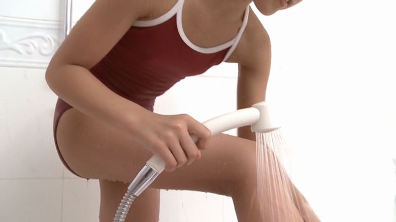 赤いスクール水着でシャワー。水着越しに乳首ぽっちを確認できます。
