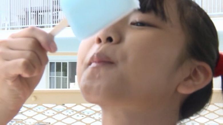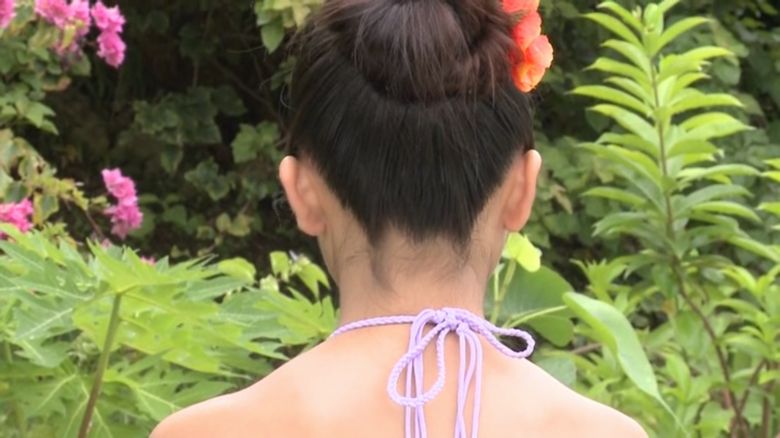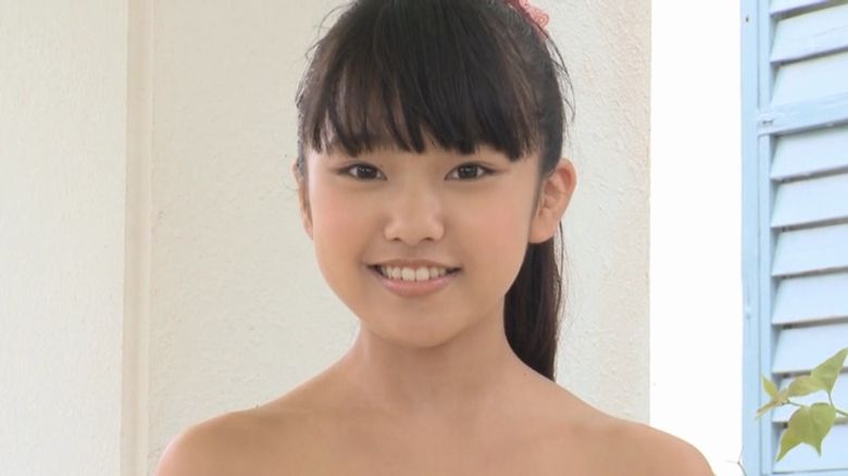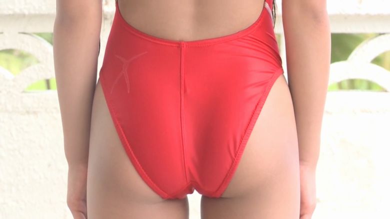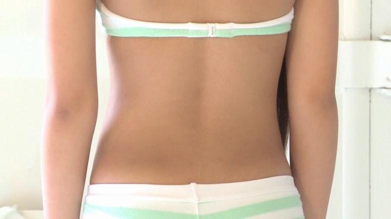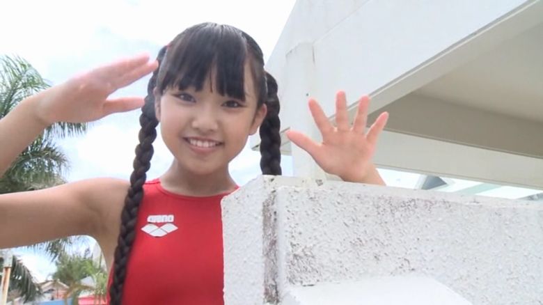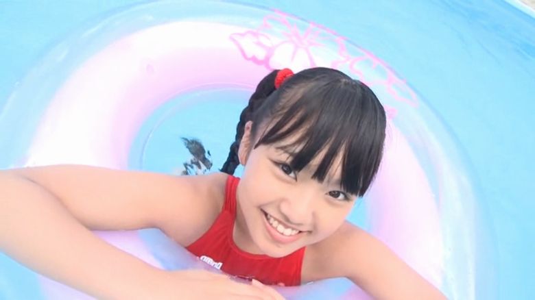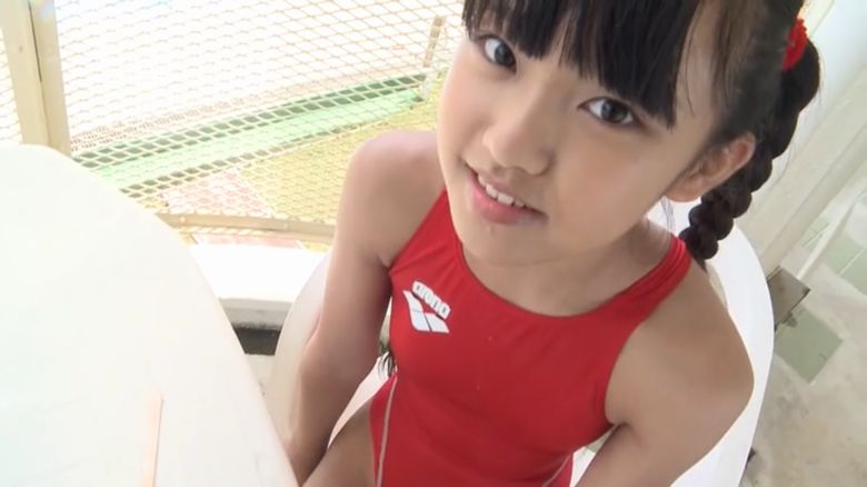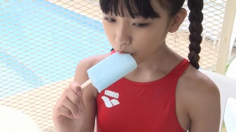 背中の空いたスクール水着でアイスを食べます。アイスを舐める舌の動きがかわいい。このシーンはおっぱいが少し大きくなったように見受けられます。