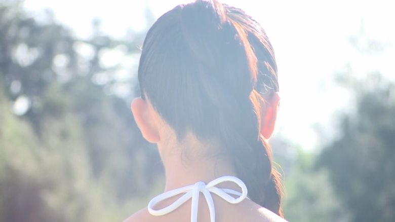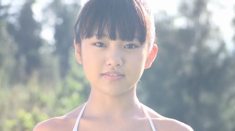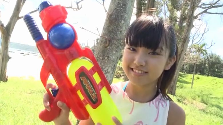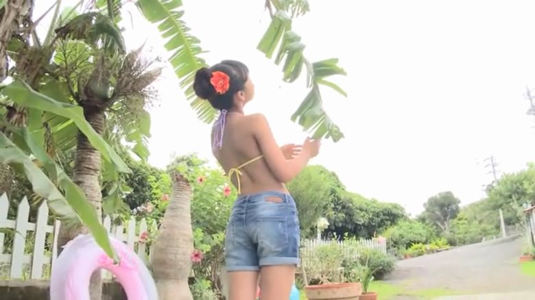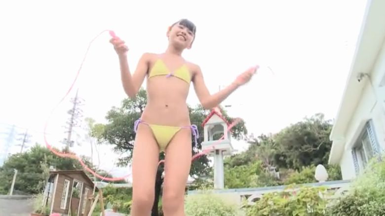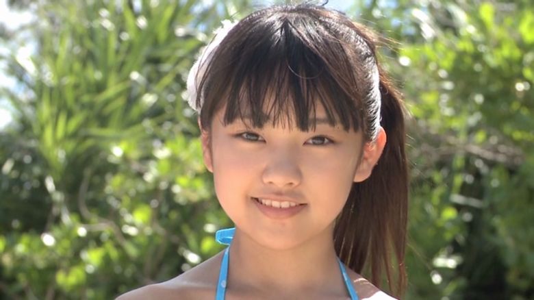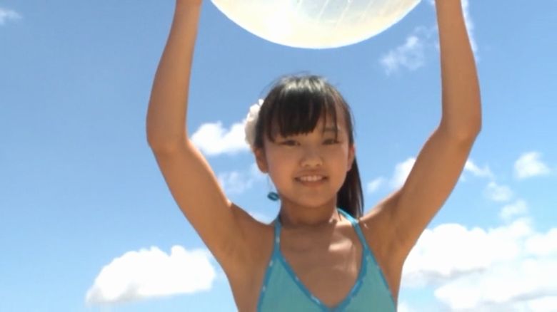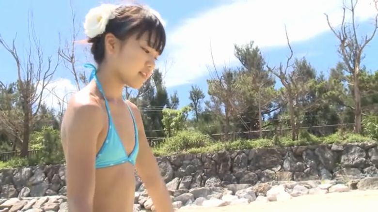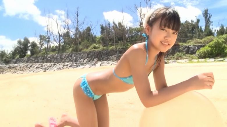 青いビキニで海ではしゃぐ杏珠ちゃん。ハイレグ水着を履き、付け根の奥まで見える足もエロいです。